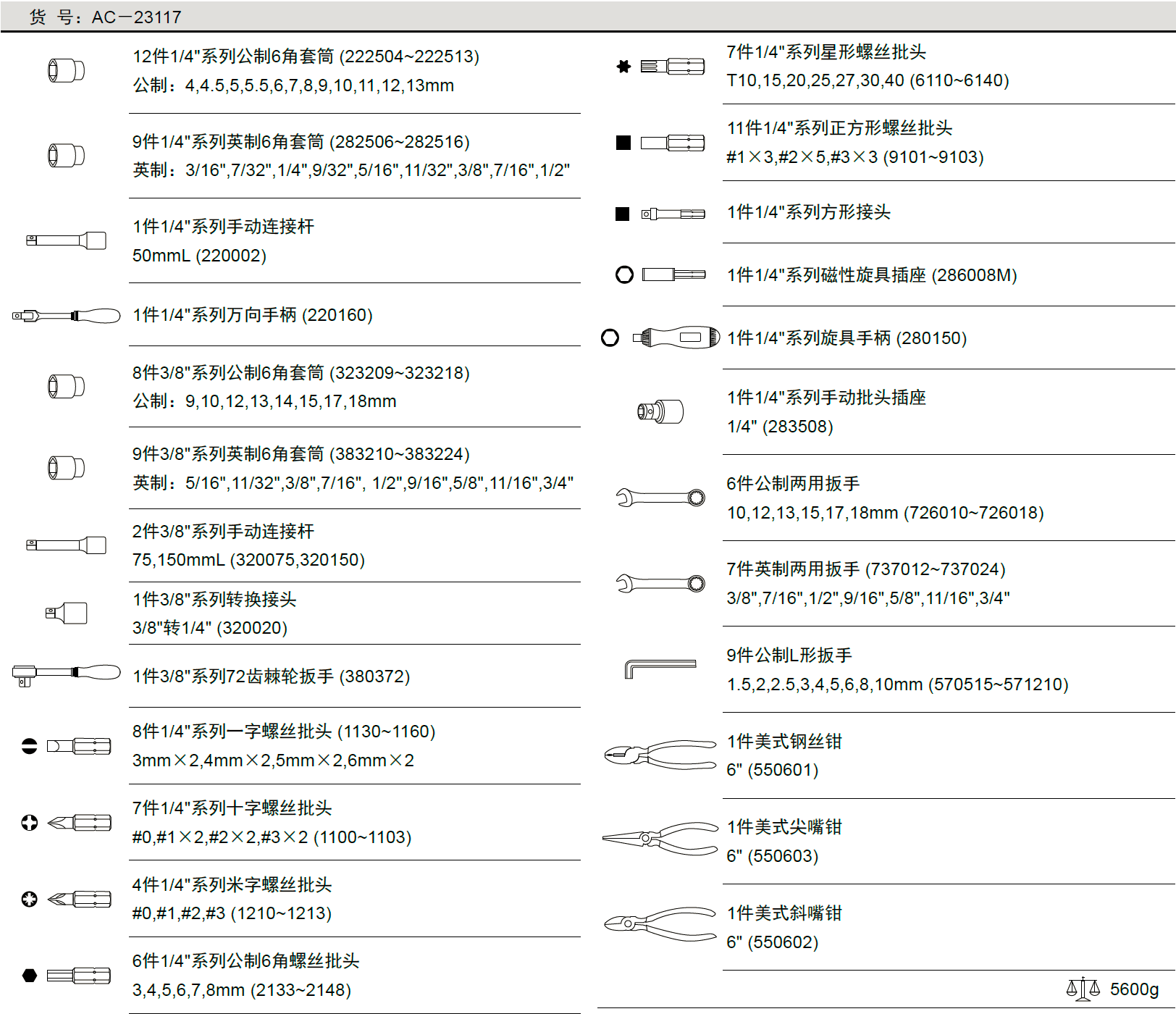 天赋工具1/4", 3/8"系列117件套公英制综合工具组AC-23117