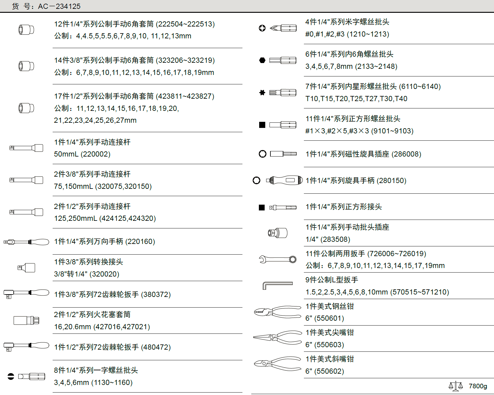 天赋工具1/4",3/8",1/2"系列 125件套公制手动综合工具组AC-234125