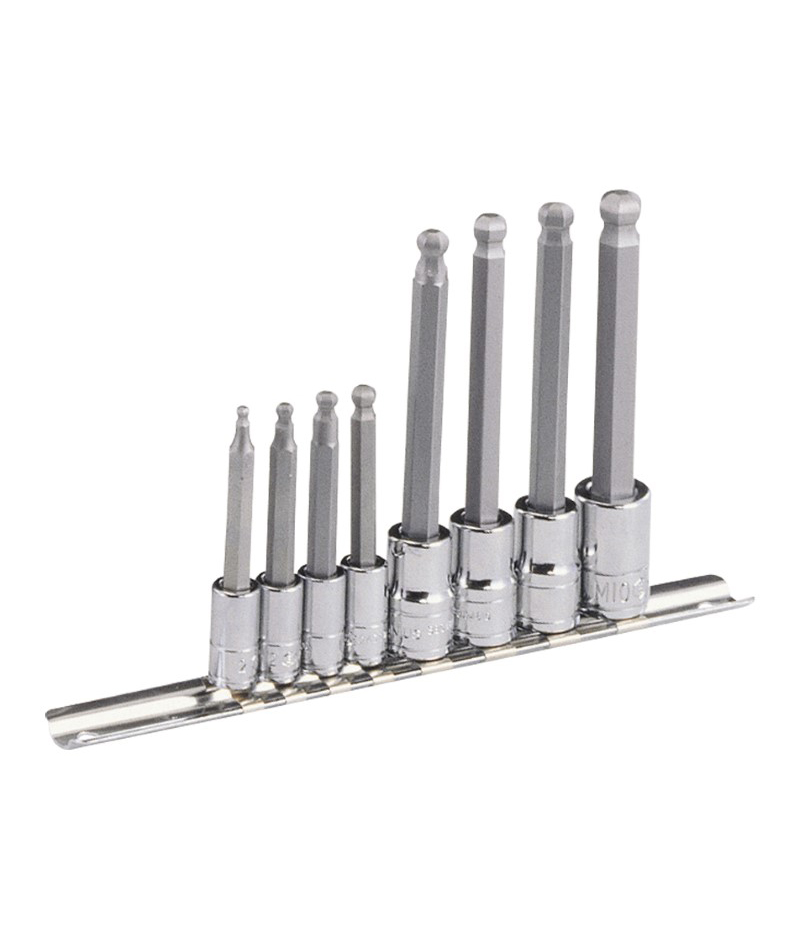 天赋工具1/4", 3/8"系列 8件套球形内6角旋具套筒组货 号:BS-2308WH4件1/4"系列球形内6角旋具套筒70mmL3,4,5,6mm (208+4333~208+4336)4件3/8"系列球形内6角旋具套筒:110mmL7,8,9,10mm (310+4547~340+4550)重量:550g