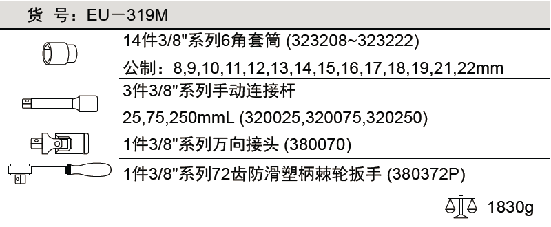 3/8"系列 19件套公制手动套筒扳手组EU-319M