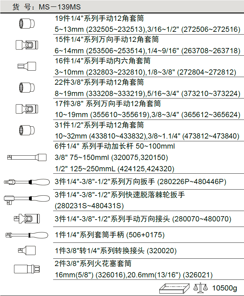 天赋工具139件1/4",3/8"&1/2"系列公英制工具组MS-139MS
