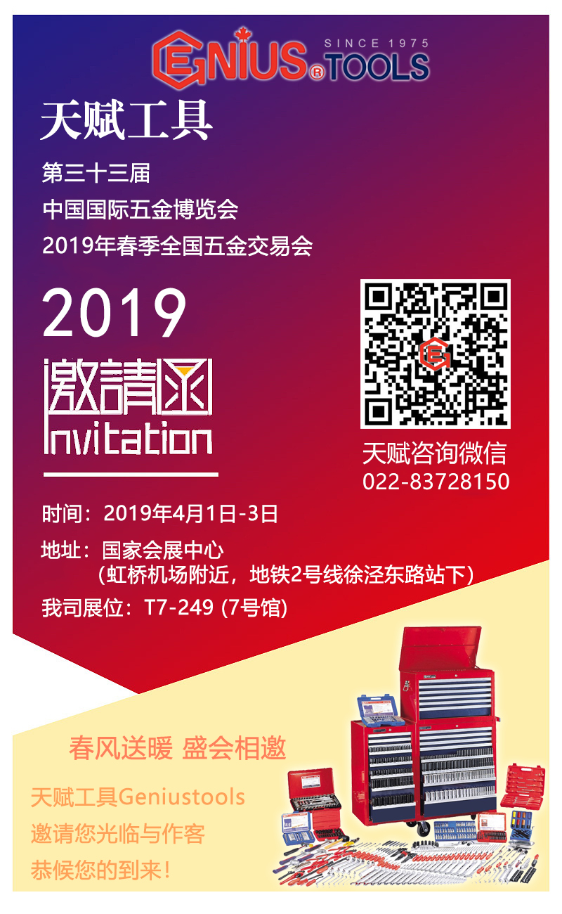 首先感谢您一直以来对天赋工具Geniustools的关怀厚爱与支持,现将2019年度春季全国五金商品交易会暨第三十三届中国国际五金博览会时间安排通知: