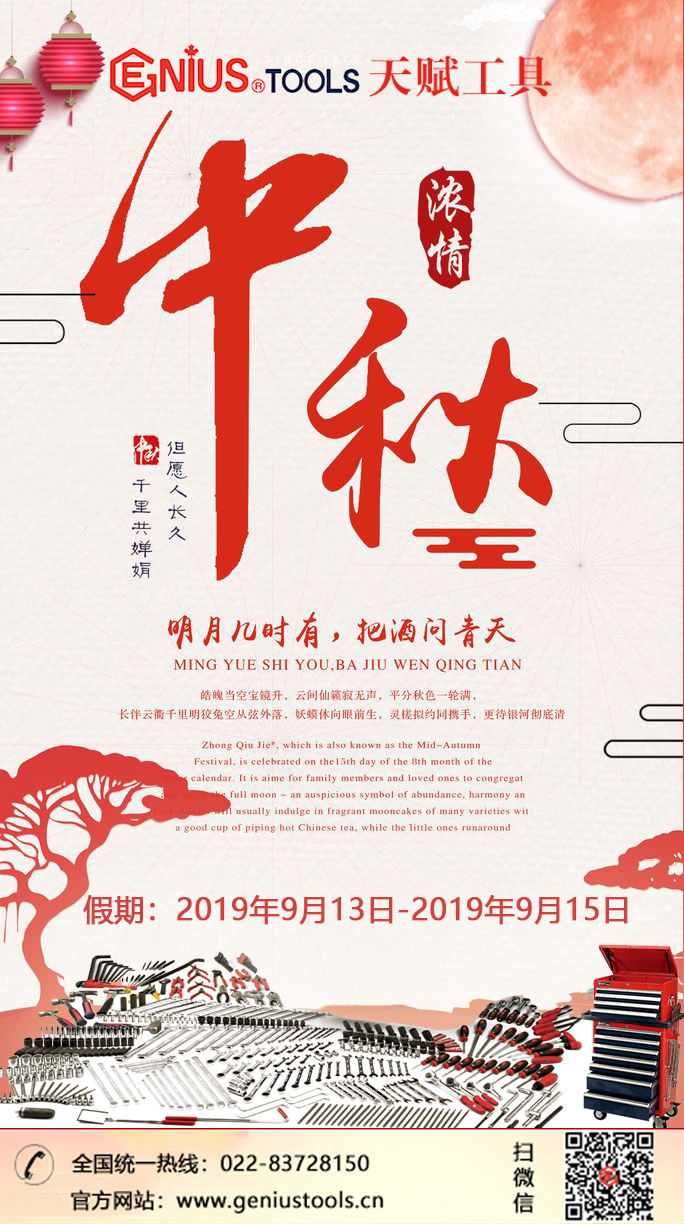 首先天赋工具Geniustools提前祝您2019年中秋快乐,阖家团圆,关怀厚爱与支持,根据家国统一安排,我司中秋放假通知时间安排通知: