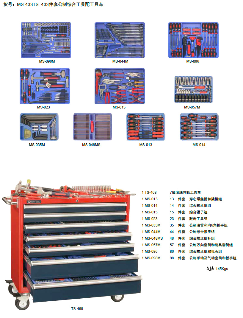 天赋工具433件公制综合工具配工具车MS-433TS,MS-433TS为天赋工具Geniustools原装进口工具车,配套433件套综合工具,适合汽车维修,机械制造,石油化工,造船,铁路,电力等多种行业使用,天赋工具Geniustools品牌工具车采购加厚不锈钢材质,坚固耐用,钢制轨道,承重力强,静音车轮,推拉轻松灵活,欢迎选购:022-83728150。