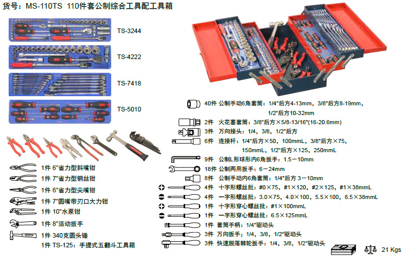 天赋工具110件套公制综合工具配工具箱MS-110TS,工业级原装进口综合工具箱MS-110TS为加拿大Geniustools出品,手提式五翻斗工具箱配110件综合工具组套,分层摆放,高效收纳,拿取快捷,携带方便。适合汽车维修,机械制造,石油化工,造船,铁路,电力等多种行业使用。MS-110TS综合工具箱采用优质加厚冷轧钢板,高精度模具成型,坚固耐用。承重力强。表面高级烤漆处理,大气美观,欢迎订购022-83728150。