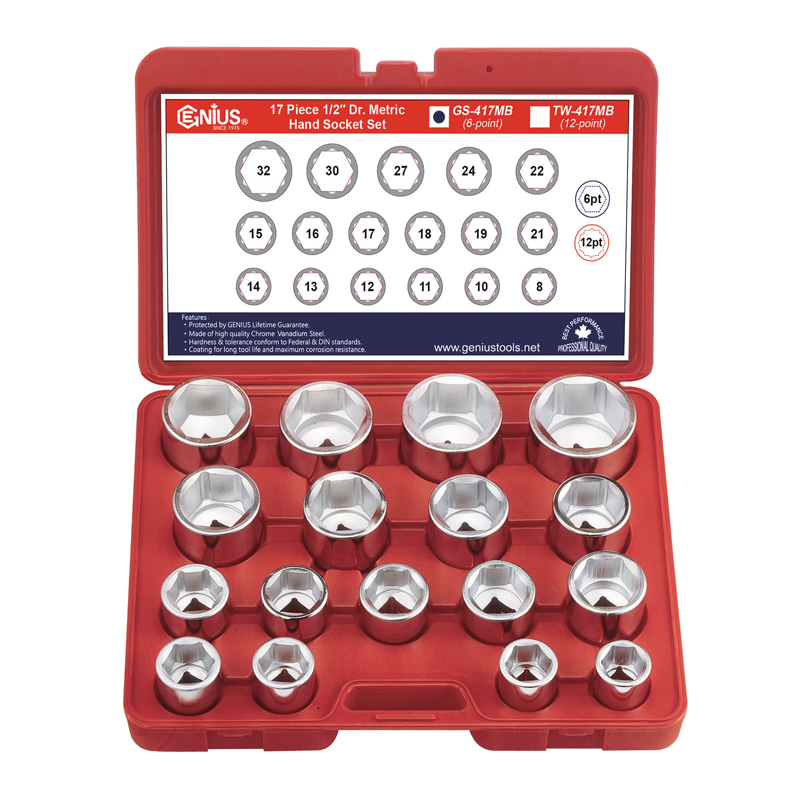 天赋工具 Geniustools 1/2" 系列17件套公制手动套筒组GS-417MB,内含1/2"系列即12.5mm公制手动6角套筒17件,订购电话:022-83728150