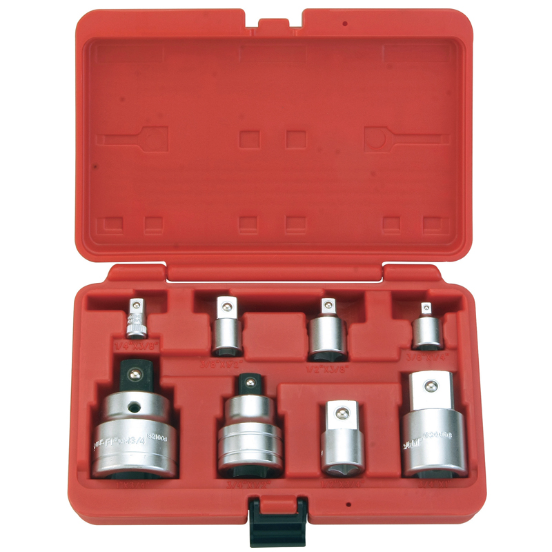 天赋工具 Geniustools 8件套手动转换接头组IA-288B,内包手动转换接头为铬钼钢材质,电脑控制“真空”热处理,深度淬火,硬度高,耐磨耐腐蚀,表面炭黑磷化,防腐防锈。圆弧内角设计,减少磨损。天赋工具红色塑箱套装 ,每个凹槽摆放对应规格型号工具,快速收纳,存取方便,不易丢失。广泛应用于各类机修装配、汽修、电力,石油,矿产等领域的设备维护。具体规格参数如下: