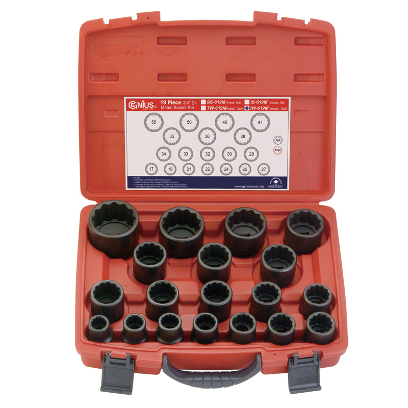 天赋工具Geniustools 3/4" 系列19件套公制气动12角套筒组IW-619M ,内含 3/4" 系列即19mm公制气动12角套筒19件,订购电话:022-83728150