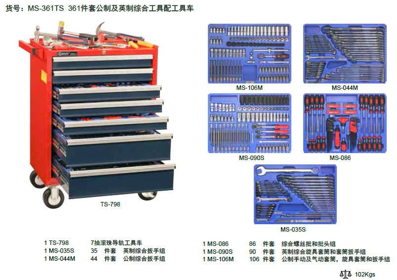 货号:MS-361TS 361件公制及英制综合工具配工具车