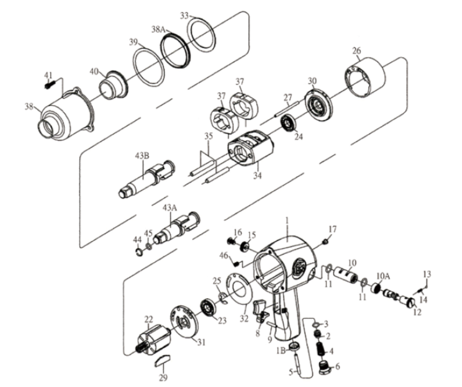 气动扳手拆解图,气动扳手分解图,就是气动扳手零部件拆解示意图,是为客户再维修气动扳手时方便选择配件的CAD结构图,我们也称气动扳手爆炸图。今天我们就天赋工具Geniustools最常用的气动扳手分解图为大家做一个介绍: