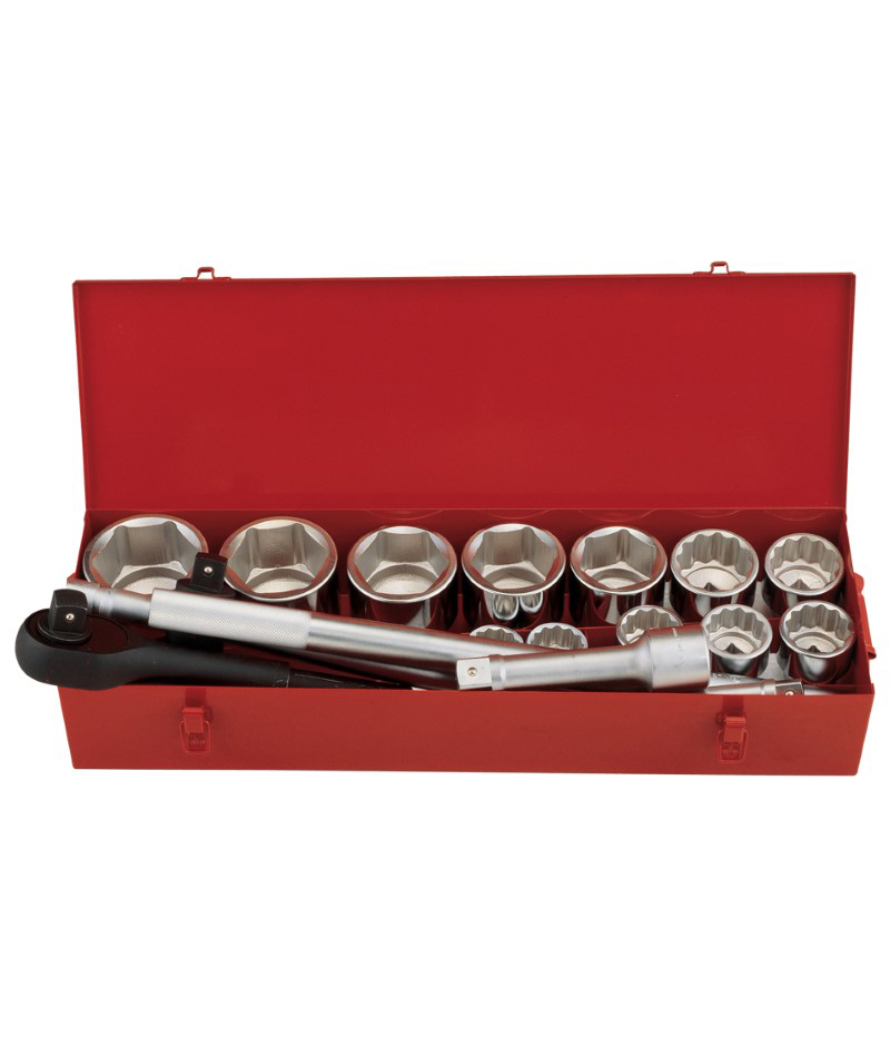 天赋工具1"系列16件公制重型套筒棘轮扳手组GS-816M,内包含手动套筒为铬钼钢材质,硬度高,耐磨耐腐蚀,表面抛光电镀,防腐防锈,更加耐用。圆弧内角设计,强劲锁定,减少磨损。天赋工具红色手提式塑盒套装,每个凹槽摆放对应规格型号工具,快速收纳,存取方便,不易丢失。广泛应用于各类机修装配、汽修、电力,石油,矿产等领域的设备维护。具体规格参数如下: