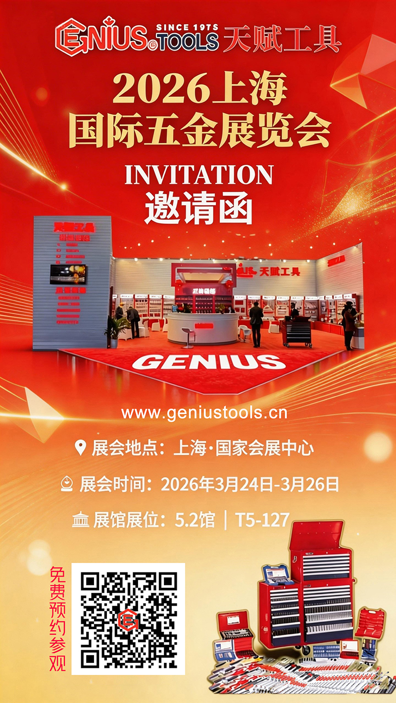 全球五金行业年度盛会-第三十九届中国国际五金博览会,于2026年3月24日-26日在国家会展中心(上海)盛大启幕,天赋工具Geniustools携全系精品重磅亮相,诚挚邀请您莅临参观洽谈!