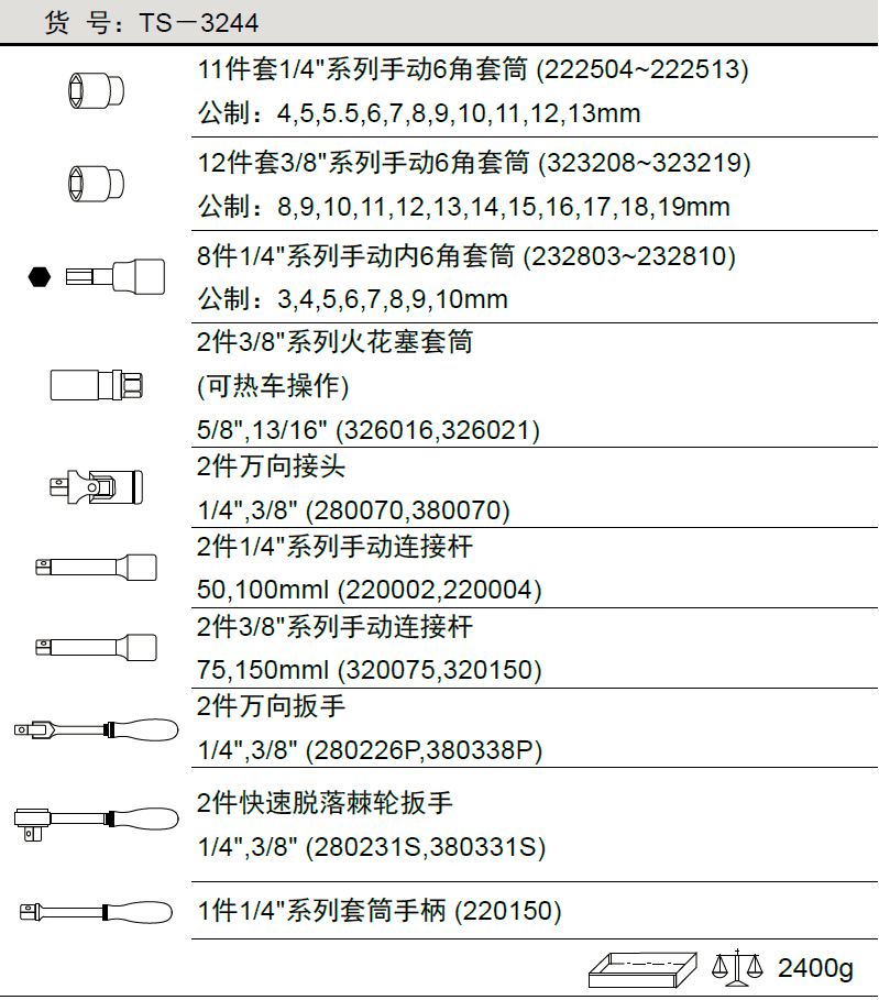 天赋工具1/4", 3/8"系列 44件套公制手动套筒扳手组TS-3244