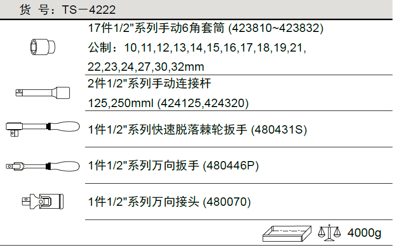 天赋工具1/2"系列22件套公制手动套筒扳手组TS-4222