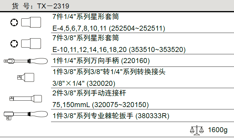 天赋工具1/4",3/8"系列 19件套手动星形套筒扳手组TX-2319